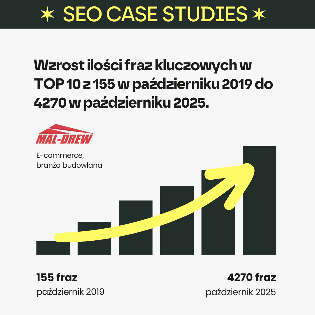 ✱ Wzrost ilości fraz kluczowych w TOP 10 z 155 w październiku 2019 do 4270 w październiku 2025. Wejście na pozycje TOP 10 na kluczowe branżowe frazy takie jak “styropian”, “wełna mineralna”, “hurtownia budowlana”, “pustak ceramiczny” itp.
